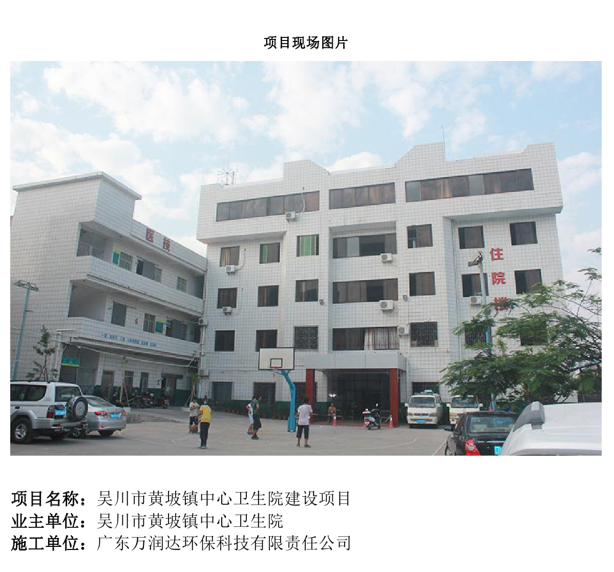 •       吴川市黄坡镇中心卫生院项目设有1栋5层住院楼、1栋4层门诊楼、1栋3层医技楼。项目总占地面积4243.89 m2,建筑面积 5500m2。项目总投资262万元,其中环保投资55万元。占总投资的21%。